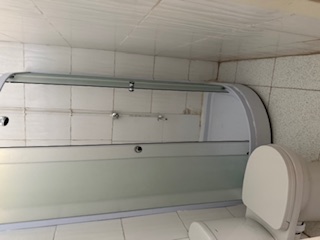 The ground floor features a partially enclosed area with an additional toilet and bath, ideal for storage, staff facilities, client reception, or operational workspace.